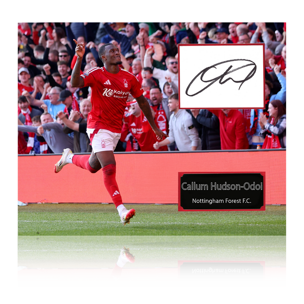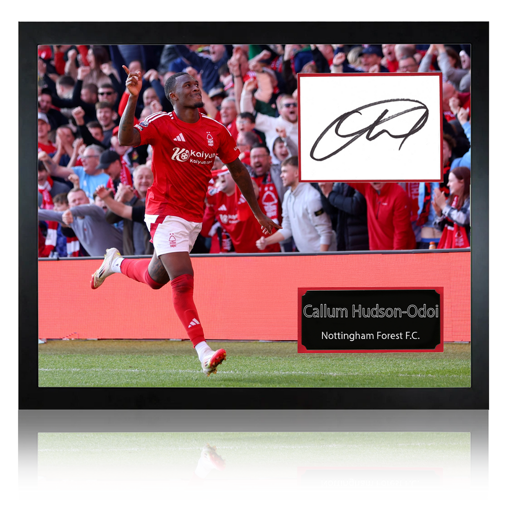 Signed mounted index card of Nottingham Forest forward Callum Hudson-Odoi. These mounts are designed to fit an off the shelf size frame and make a great addition to any collection. This item measures approximately 500mm x 400mm...