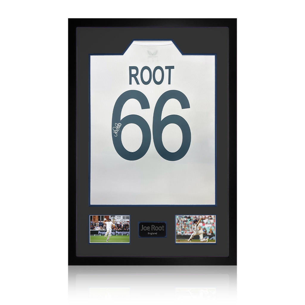 Framed England Test Shirt display with a custom engraved plaque, two photos & black top mount. Contains a shirt signed by England cricket legend, Joe Root. This would make a great addition to any cricket collection. This it...