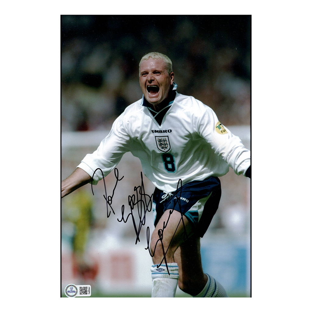 A signed 12x8 of Paul Gascoigne This item is accompanied with an certificate of authenticity from The Fan Cave. This image would make a great addition to any football collection.