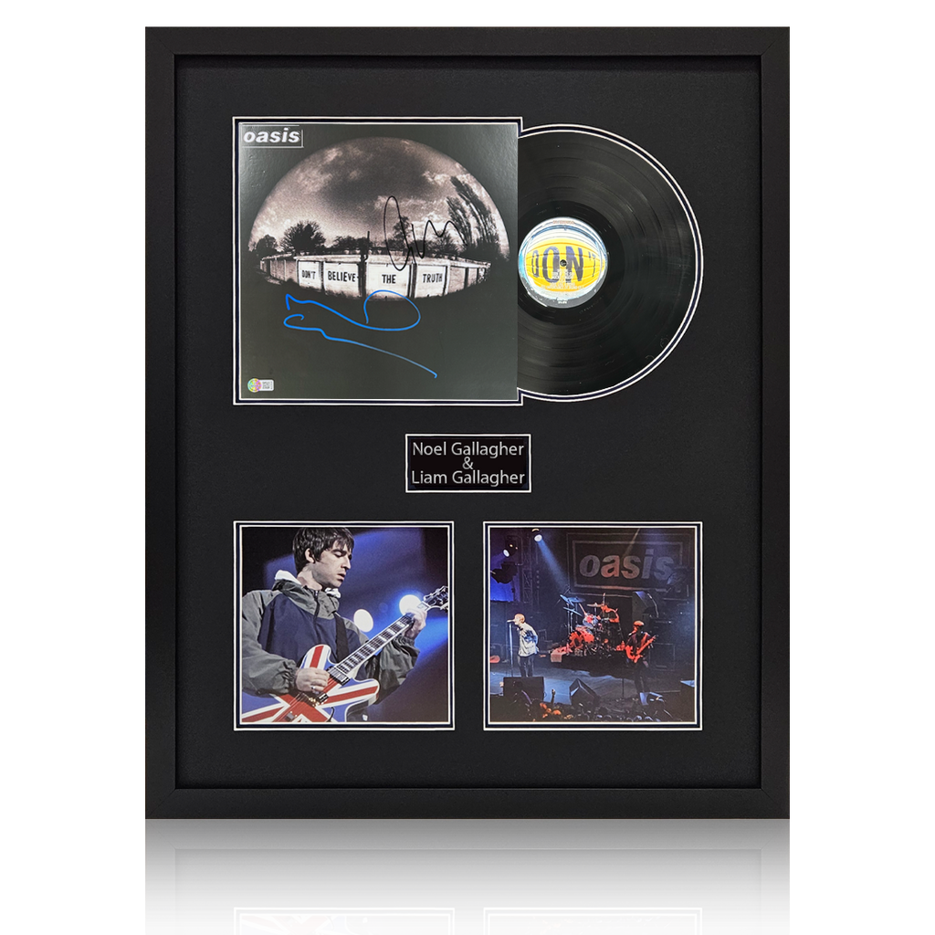 This fantastic looking display measuring approximately 860mm x 705mm contains the "Don't Believe The Truth" LP signed by Noel & Liam Gallagher. This is presented with a plaque and two iconic performance photos. The autograp...