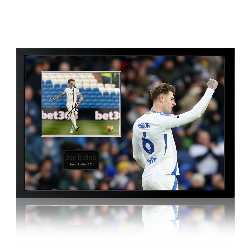 Poster mounted and framed 10x8 image signed by Leeds United player; Joe Rondon. This item measures approximately 690mm x 480mm. This item is accompanied with an certificate of authenticity from The Fan Cave. Please note signatu...