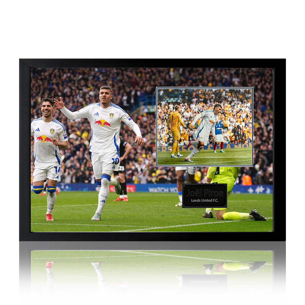 Poster mounted and framed 10x8 image signed by Leeds United player; Joël Piroe. This item measures approximately 690mm x 480mm. This item is accompanied with an certificate of authenticity from The Fan Cave. Please note signat...