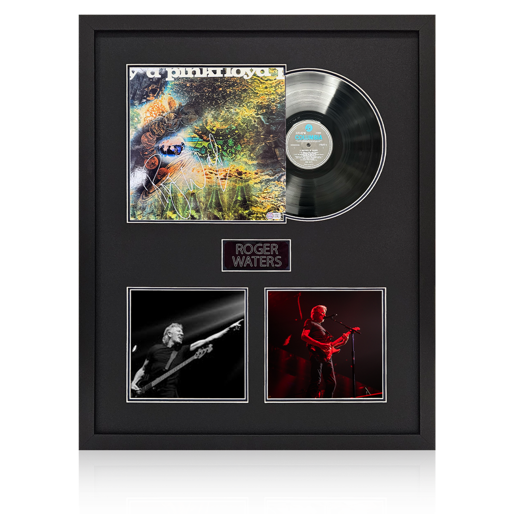 This fantastic looking display measuring approximately 860mm x 705mm contains the Pink Floyd LP signed by Roger Waters . This is presented with a plaque and two iconic performance photos. The autograph includes an official AFTA...