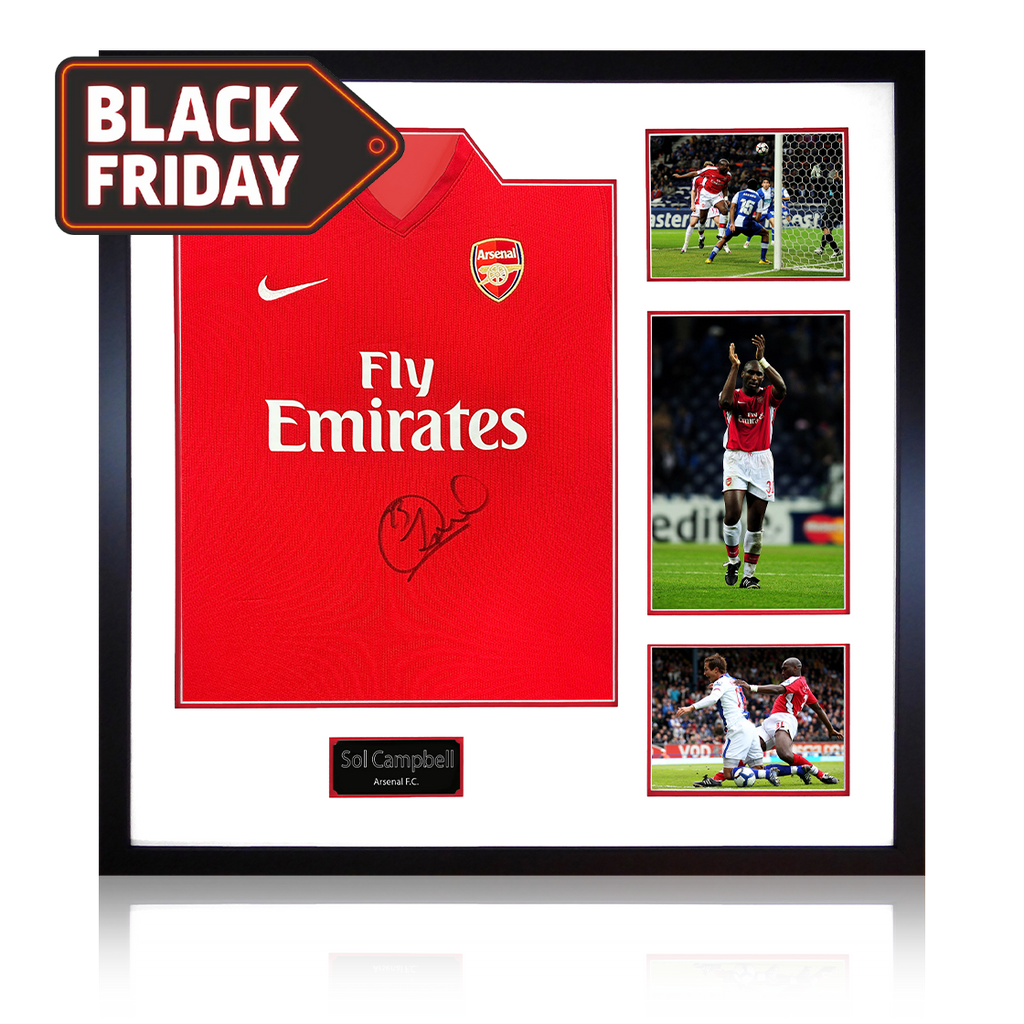 A signed Arsenal shirt by Sol Campbell in a Classic Frame. The item was signed at a private signing on the 06/03/25. This item is accompanied with an certificate of authenticity from The Fan Cave.