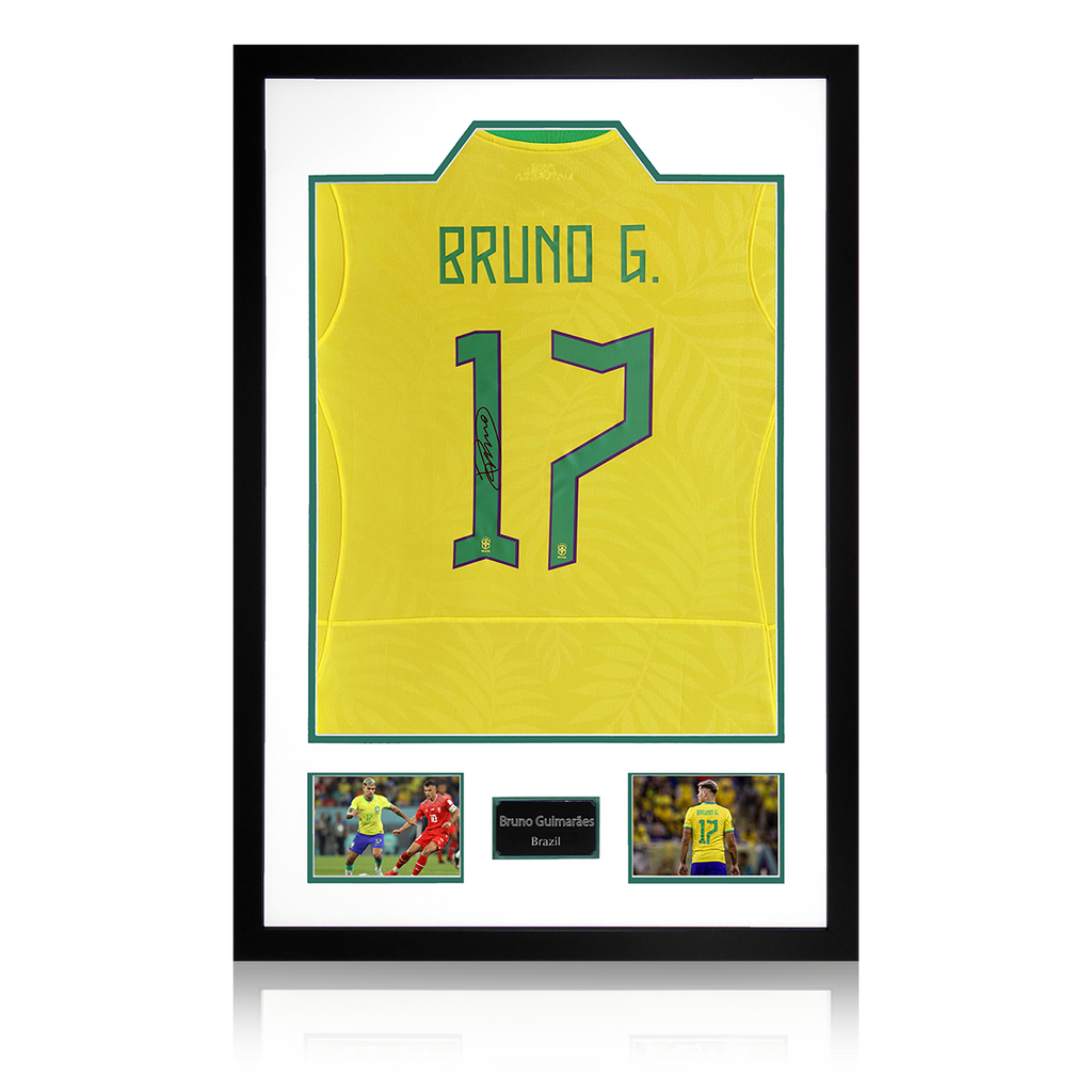 A framed Brazil signed shirt by Bruno Guimarães. This item was signed at an exclusive Fan Cave signing with Bruno on 16/08/23.
