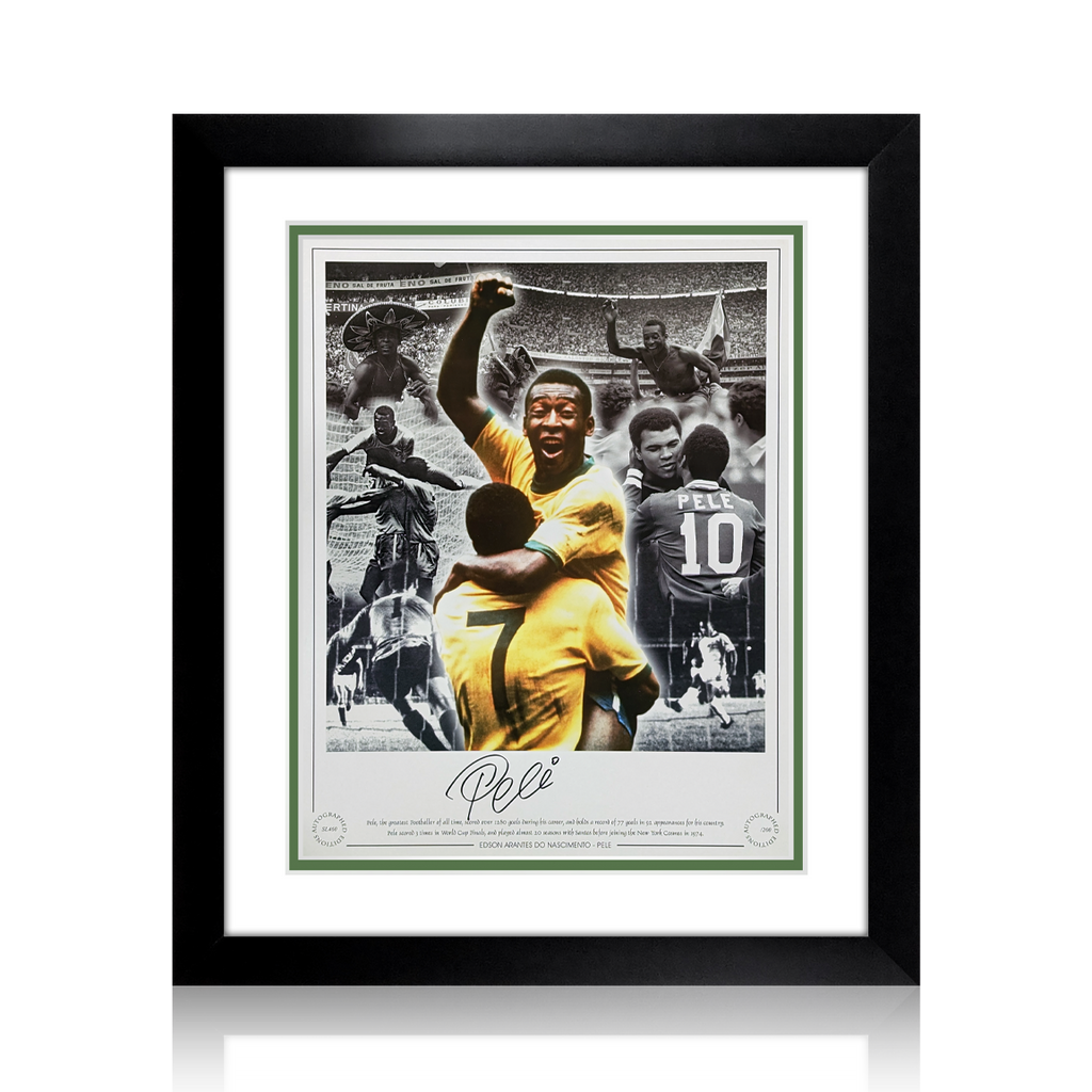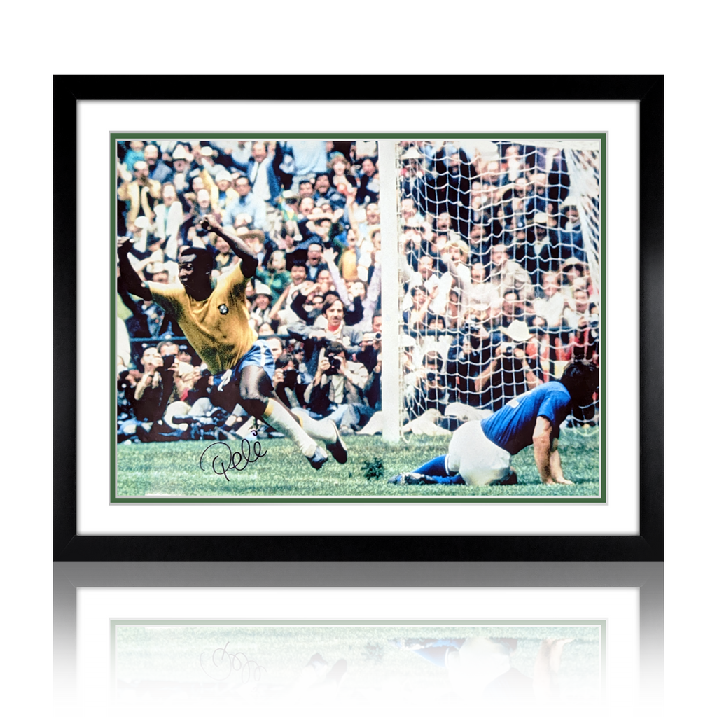One of a limited number of 100 displays from the 1970 World Cup final in Mexico. This mounted photo display in a wooden frame has been signed by Brazilian icon and football legend; Pele.