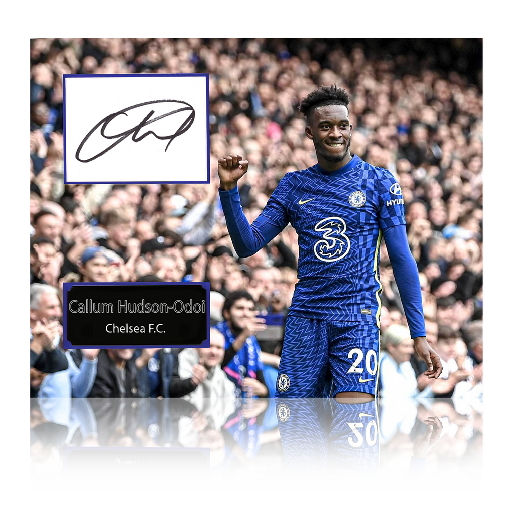 Signed mounted index card of former Chelsea forward Callum Hudson-Odoi. These mounts are designed to fit an off the shelf size frame and make a great addition to any collection. This item measures approximately 500mm x 400mm. S...