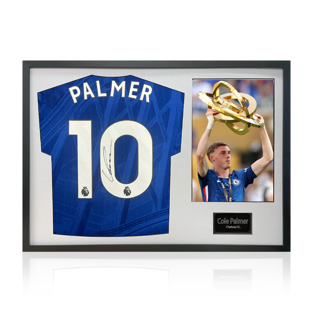 Beautifully presented Premium Frame with signed Chelsea 25/26 shirt by Cole Palmer. This item was signed at an exclusive Fan Cave signing with Cole on the 04/04/25. The frame measures approximately 850mm x 600mm. This item is a...
