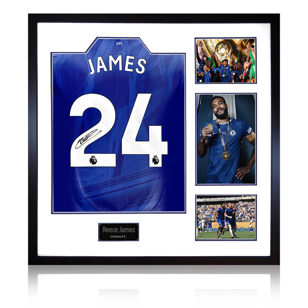 Beautifully presented Premium Frame with signed Chelsea shirt by Reece James. The frame measures approximately 820mm x 820mm. This item is accompanied with an certificate of authenticity from The Fan Cave & third party auth...