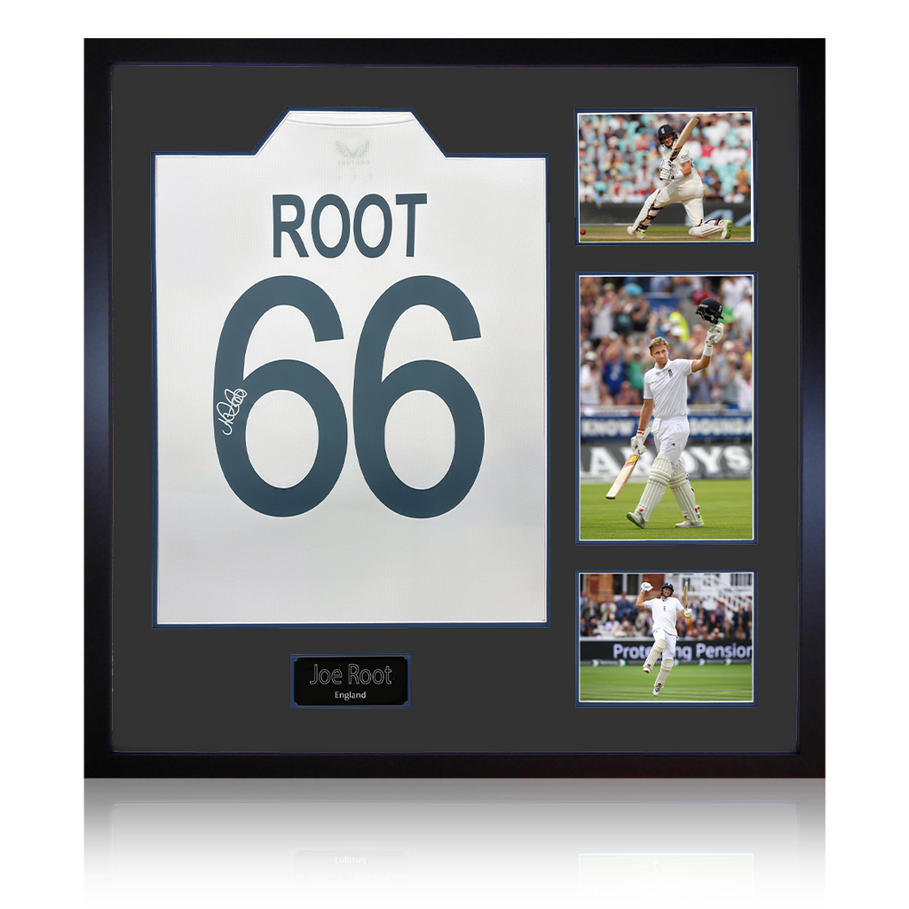 Framed England Test Shirt display with a custom engraved plaque, three photos & white top mount. Contains a shirt signed by England cricket legend, Joe Root. This would make a great addition to any cricket collection. This ...
