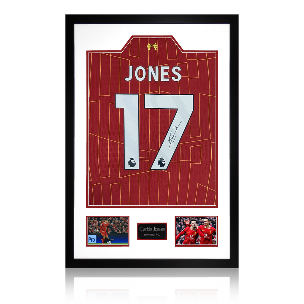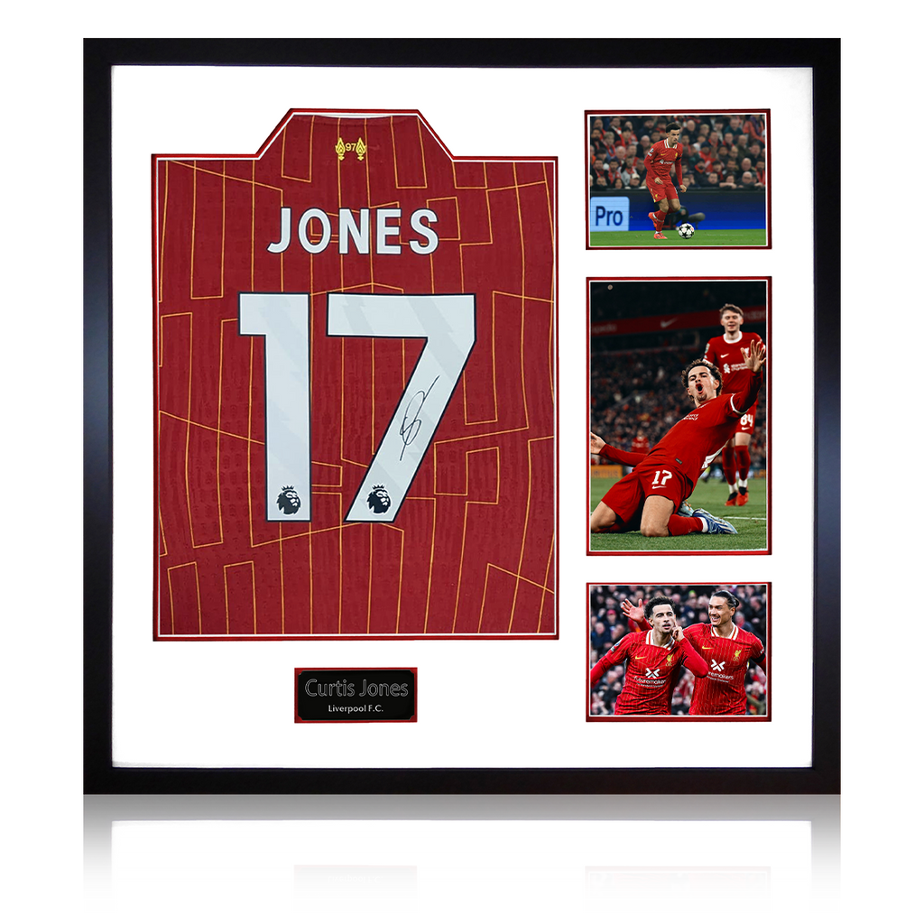 Beautifully presented Elite Frame with signed Liverpool 24/25 shirt from Curtis Jones. The autograph includes an official AFTAL Authentication hologram for authenticity purposes. This item measures approximately 820mm x 820mm. ...