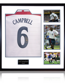 A signed England shirt by Sol Campbell in a Elite Frame. The item was signed at a private signing on the 06/03/25. This item is accompanied with an certificate of authenticity from The Fan Cave.