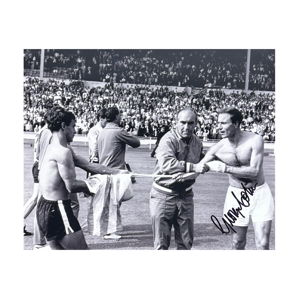 Signed, mounted and wooden framed display of England and Manchester United legend. Sir Bobby Charlton