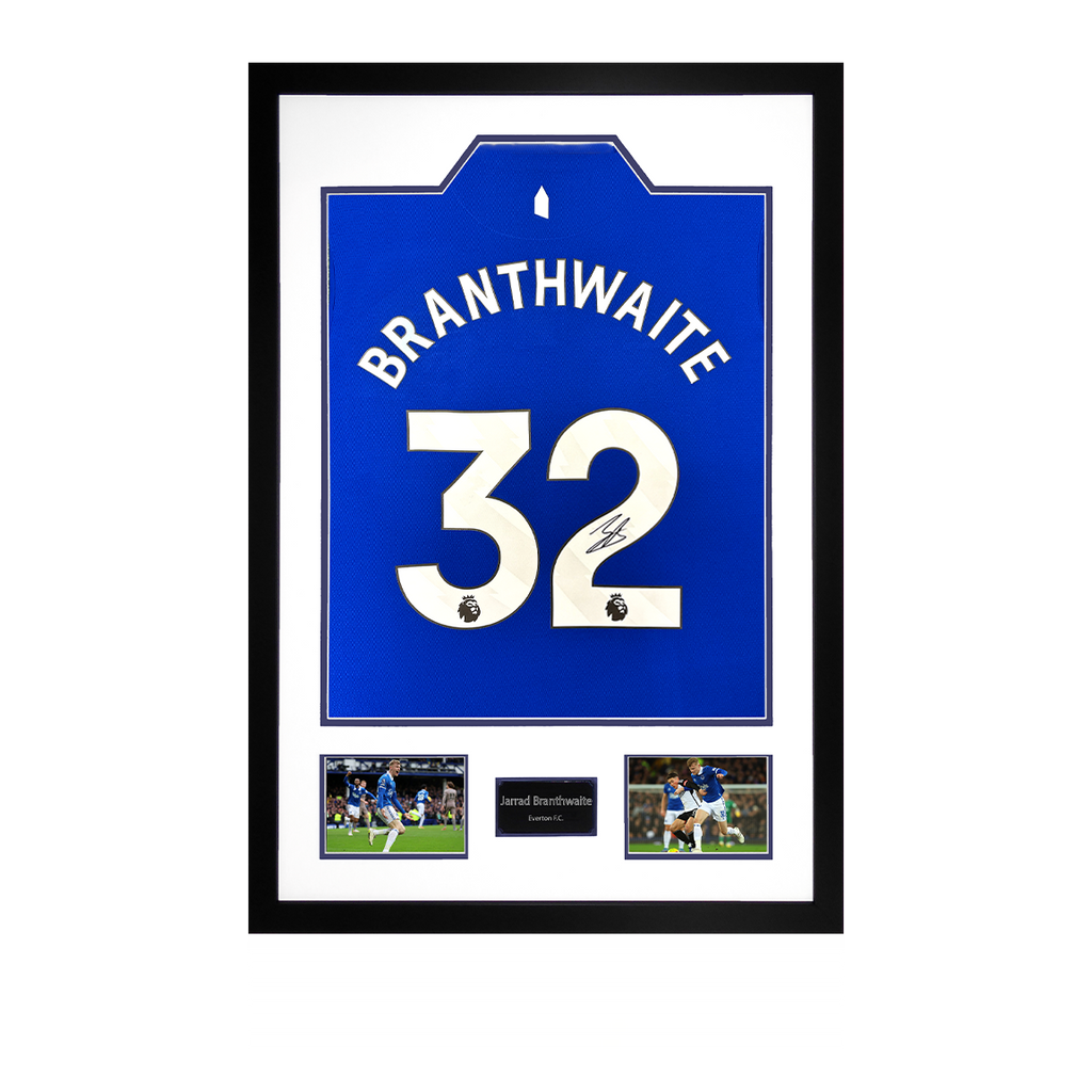 Beautifully presented Elite Frame with signed Everton shirt from Jarrad Branthwaite. This item was signed at an exclusive Fan Cave signing with Jarrad on the 29/02/24. The frame measures approximately 820mm x 820mm. This item i...