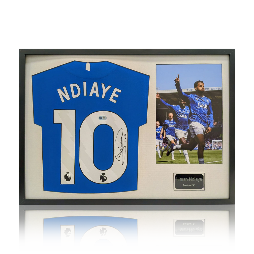 Beautifully presented Premium Frame with signed Everton shirt by Iliman Ndiaye. The frame measures approximately 850mm x 600mm. This item is accompanied with an certificate of authenticity from The Fan Cave & third party au...