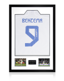 2 photo signed shirt display by Karim Benzema. He made his Real Madrid debut on 20/07/09 in a friendly against Shamrock Rovers where he was substituted on and scoring the winner in a 1-0 victory. So far in his Real Madrid Career he has won 22 domestic trophies including the UEFA Champions League 5 times.