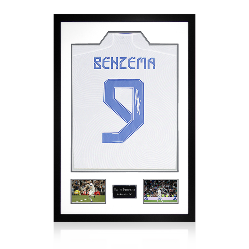 2 photo signed shirt display by Karim Benzema. He made his Real Madrid debut on 20/07/09 in a friendly against Shamrock Rovers where he was substituted on and scoring the winner in a 1-0 victory. So far in his Real Madrid ...