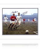 A signed mounted photo by Bobby and Jack Charlton. This is a photo of the Charlton brothers playing against each other with Bobby playing for Manchester United and Jack playing for his beloved Leeds. This mount is designed to fit an off the shelf sized frame and would make a great addition to any collection.