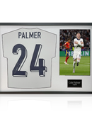 Framed shirt presentation signed by England striker Cole Palmer. This framed display contains a signed shirt, a custom plaque and an iconic image at England. This item was signed at an exclusive Fan Cave signing with Cole on 29/08/24.