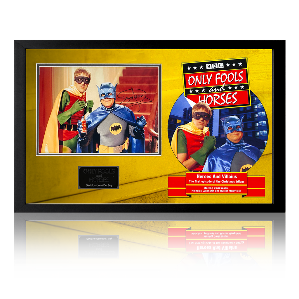 Wooden Framed photo display of hit British Comedy Only Fools and Horses. Contains an iconic image signed by "Del-Boy Trotter" portrayed by David Jason (Sir David John White OBE). 'Only Fools' is one of the most beloved comedy s...