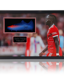 Wooden framed poster display with a mounted football boot by Bayern Munich striker Sadio Mane. He made the move to the Bundesliga side in June 2022 making his debut in the DFL - Supercup.