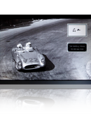 Beautiful poster mount display in a frame of the 1955 Mille Miglia winning Mercedes 722. This presentation also contains a card signed by motor racing legend; Sir Stirling Moss