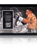 Framed poster mount signed glove display by Teofimo Lopez. "The Takeover" has had 20 fights with a record of 19 wins and 1 loss With 13 of those victories ending in a KO.
