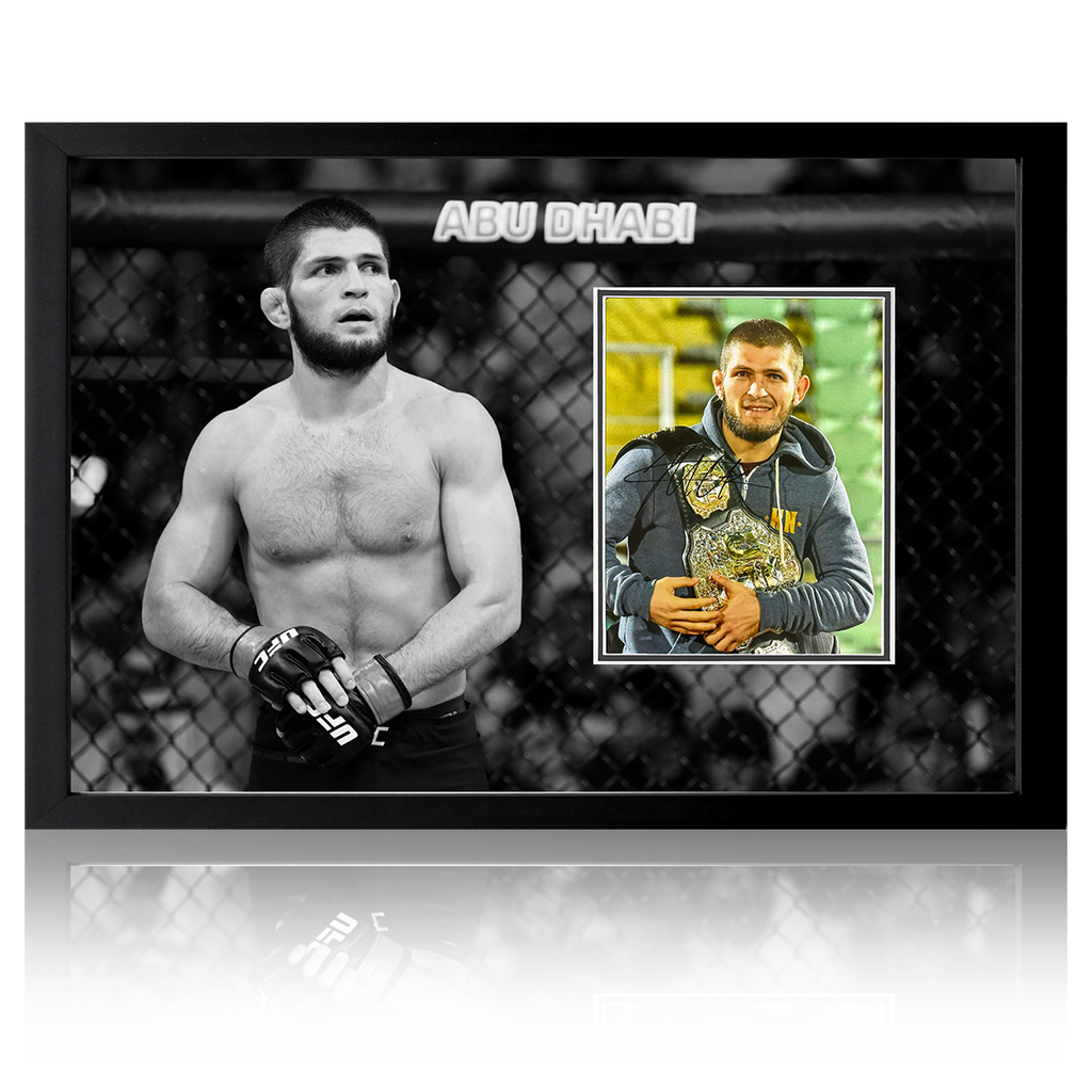 A signed framed poster mount display by Khabib Nurmagomedov. "The Eagle" has an undefeated mixed martial arts record of 29 wins in 29 fights with 8 of those wins ending in a KO.