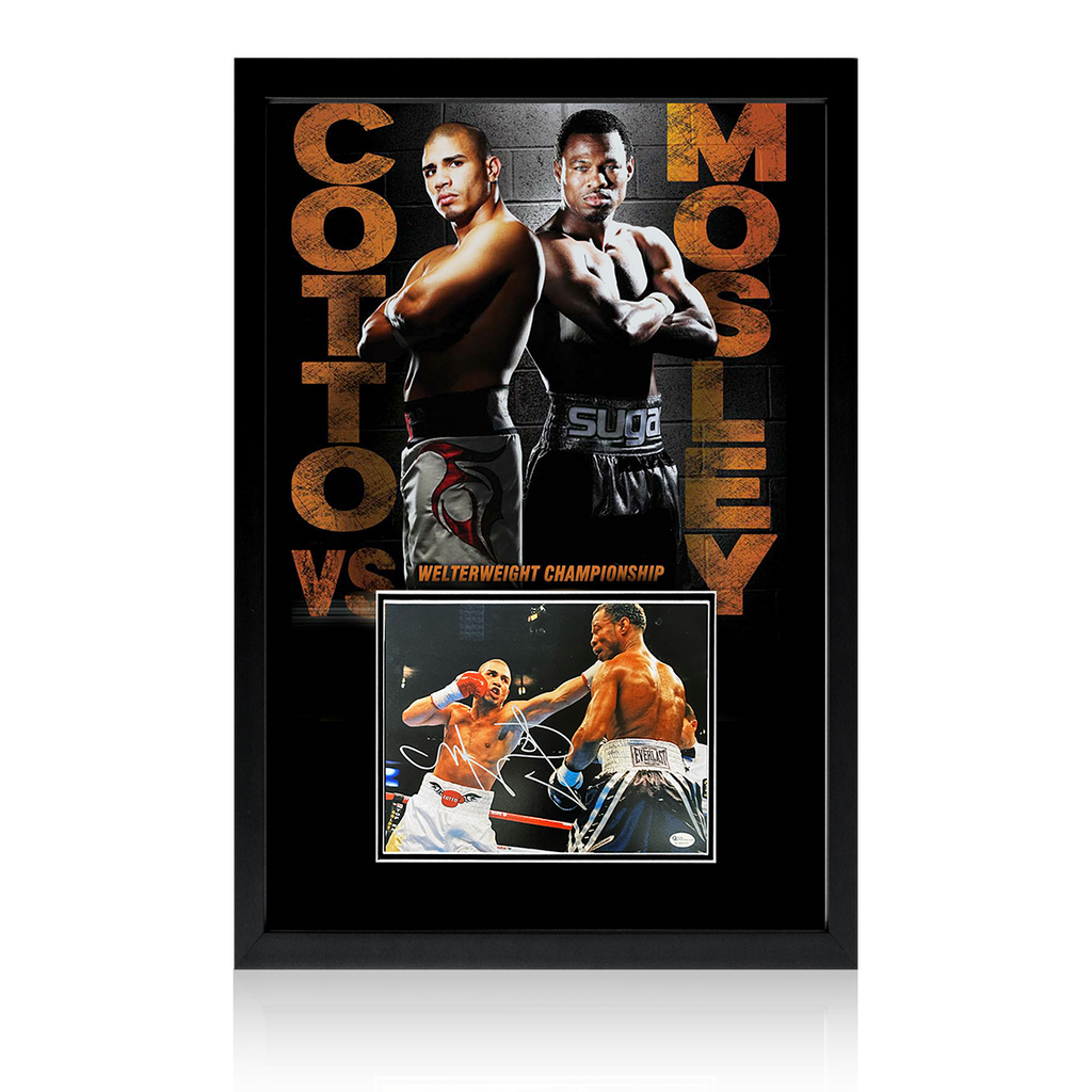 Framed presentation of boxing legend Miguel Cotto. This poster mount display contains a signed 10x8 image and would be a fantastic addition to any boxing collection.