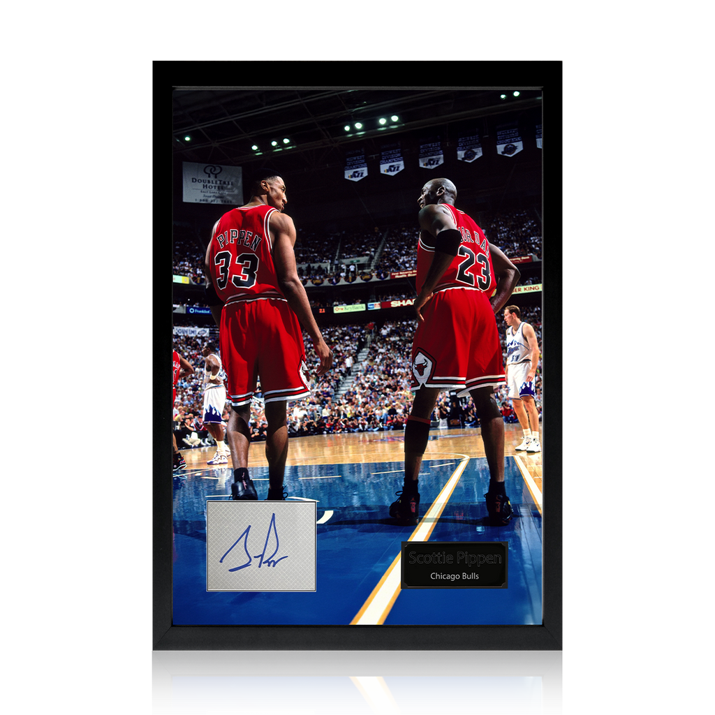 Scottie Pippen signed index card in a Iconic Frame. This would make a great addition to any NBA collection. This item measures approximately 690mm x 480mm. This item is accompanied with an certificate of authenticity from T...