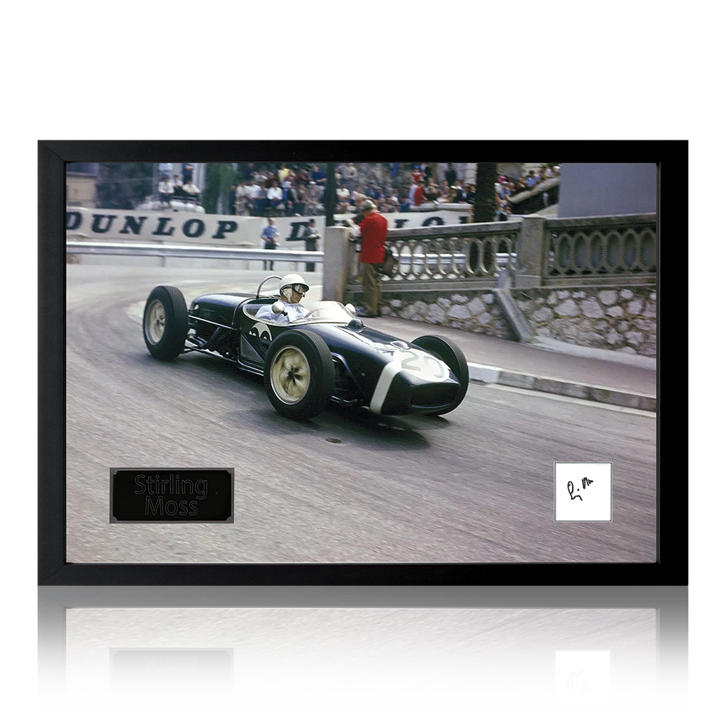 Beautiful poster mount display in a frame of 1961 Monaco Grand Prix winning Lotus 18. Includes a card signed by driver and motorsport legend Sir Stirling Moss. This item is accompanied with an certificate of authenticity from T...