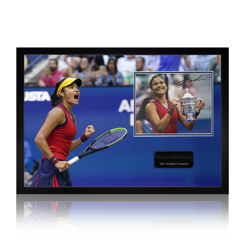 Emma Raducanu signed tennis 2021 US Open image in a Iconic frame. This item comes with an The Fan Cave Memorabilia certificate of authenticity. This item measures approximately 690mm x 480mm.