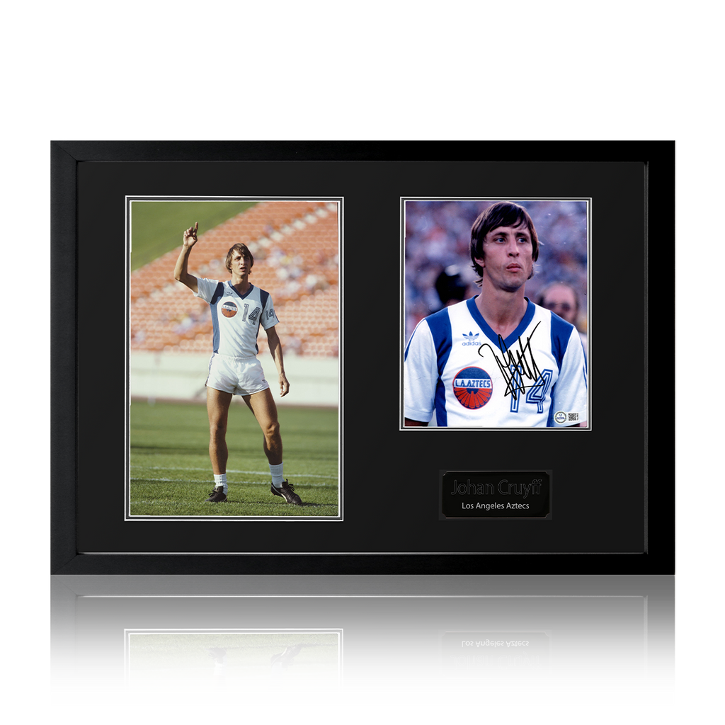Beautifully presented Iconic Frame with signed Los Angeles Aztecs image of Johan Cruyff. This item measures approximately 690mm x 480mm. This item is accompanied with an certificate of authenticity from The Fan Cave.