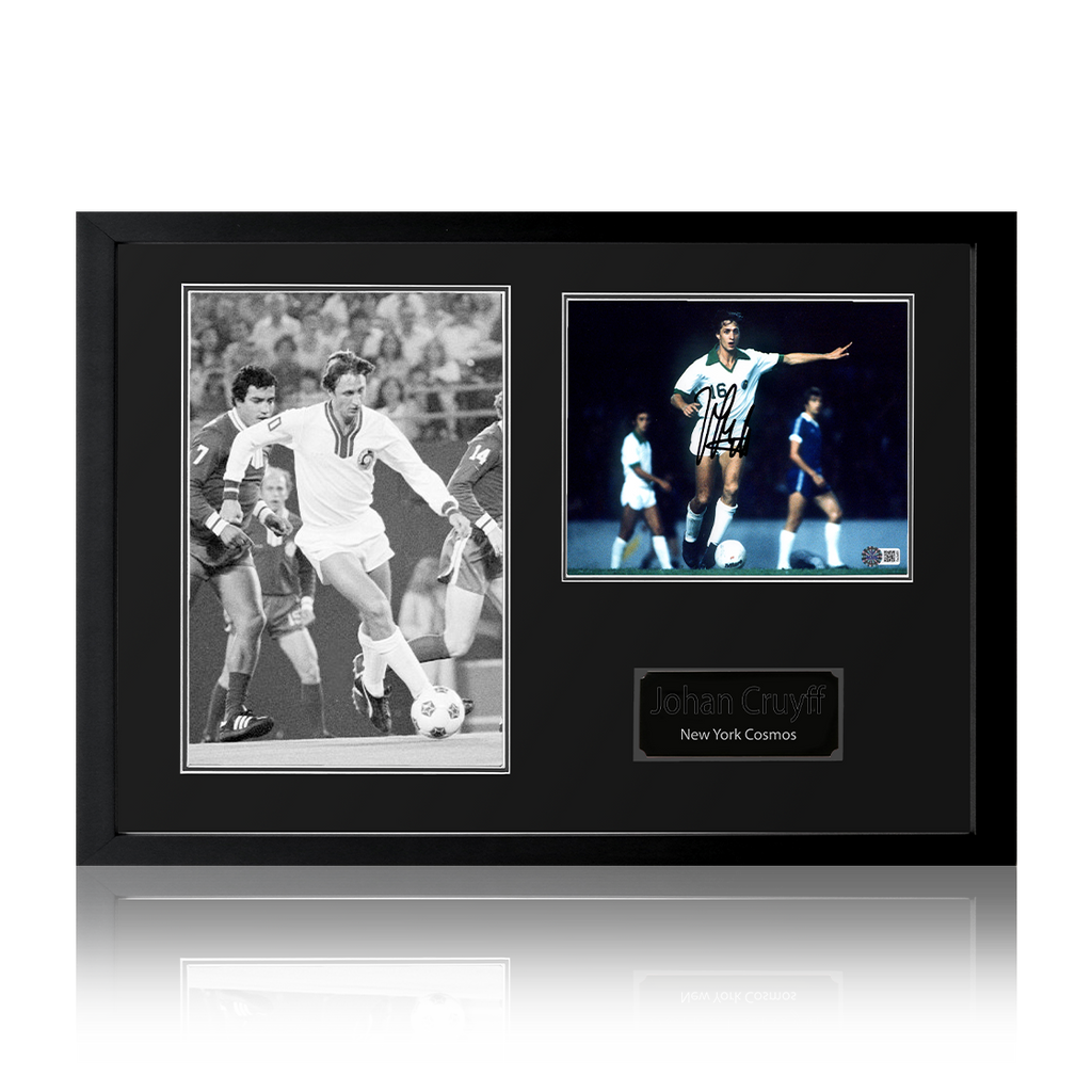 Beautifully presented Iconic Frame with signed New York Cosmos image of Johan Cruyff. This item measures approximately 690mm x 480mm. This item is accompanied with an certificate of authenticity from The Fan Cave.