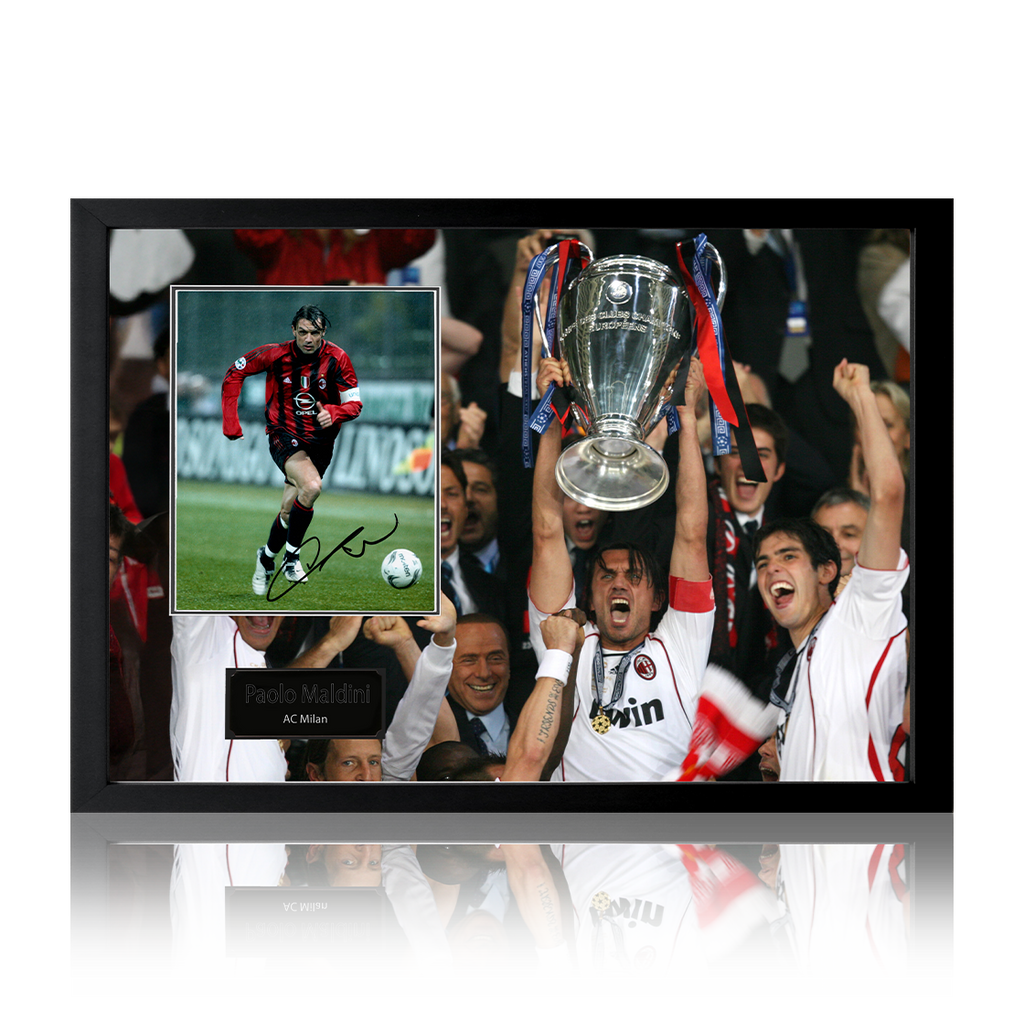Beautifully presented Iconic Frame with signed AC Milan image of Paolo Maldini. This item measures approximately 690mm x 480mm. This item is accompanied with an certificate of authenticity from The Fan Cave.