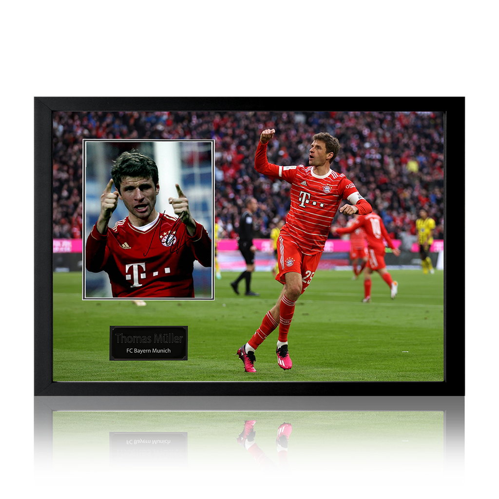 Beautifully presented Iconic Frame with signed FC Bayern Munich image of Thomas Muller. This item measures approximately 690mm x 480mm. This item is accompanied with an certificate of authenticity from The Fan Cave.