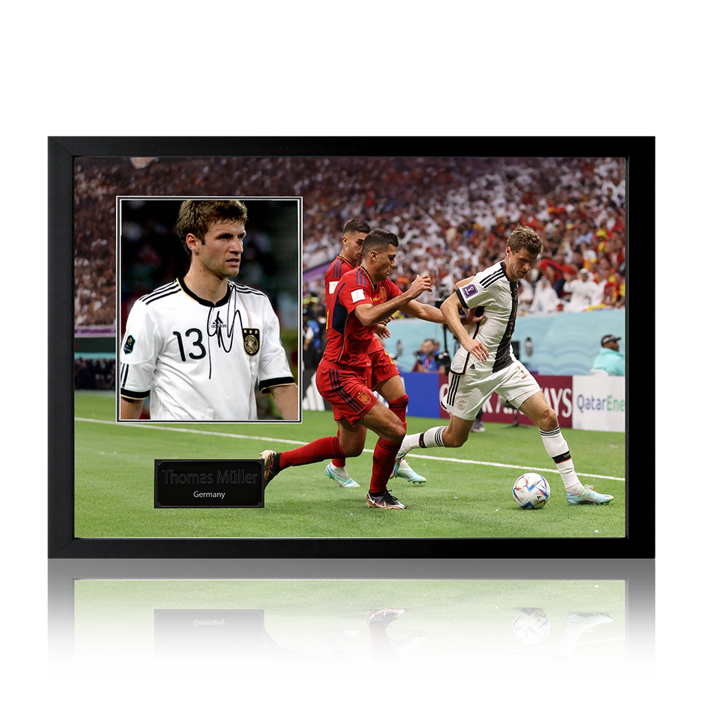 Beautifully presented Iconic Frame with signed Germany image of Thomas Muller. This item measures approximately 690mm x 480mm. This item is accompanied with an certificate of authenticity from The Fan Cave.