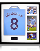 3 photo signed shirt display by Ilkay Gundogan. So far in his Manchester City career his has won 11 trophies with the club which include 4 Premier League titles, 1 FA Cup, 2 Community Shields and 4 League Cups in a row.