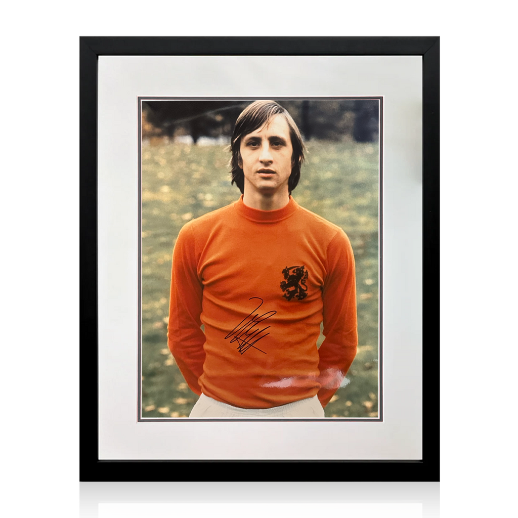A signed 16x12 mounted image in a frame of Dutch legend Johan Cruyff. As a Dutch international, Cruyff played 48 matches, scoring 33 goals. The national team never lost a match in which Cruyff scored.
