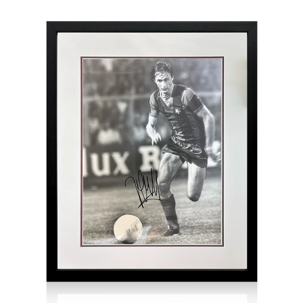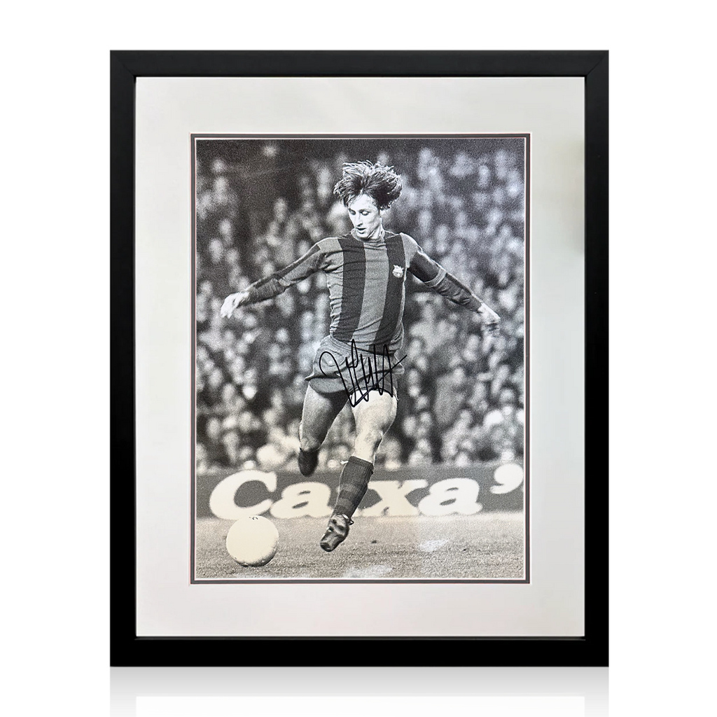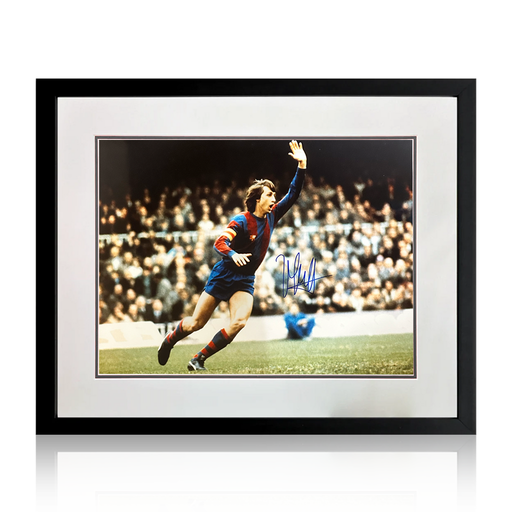A signed 16x12 mounted image in a frame of Dutch legend Johan Cruyff. When Cruyff joined Barcelona in 1973 he helped the club win their first league title since 1960, defeating their fiercest rivals Real Madrid 5–0 at their hom...