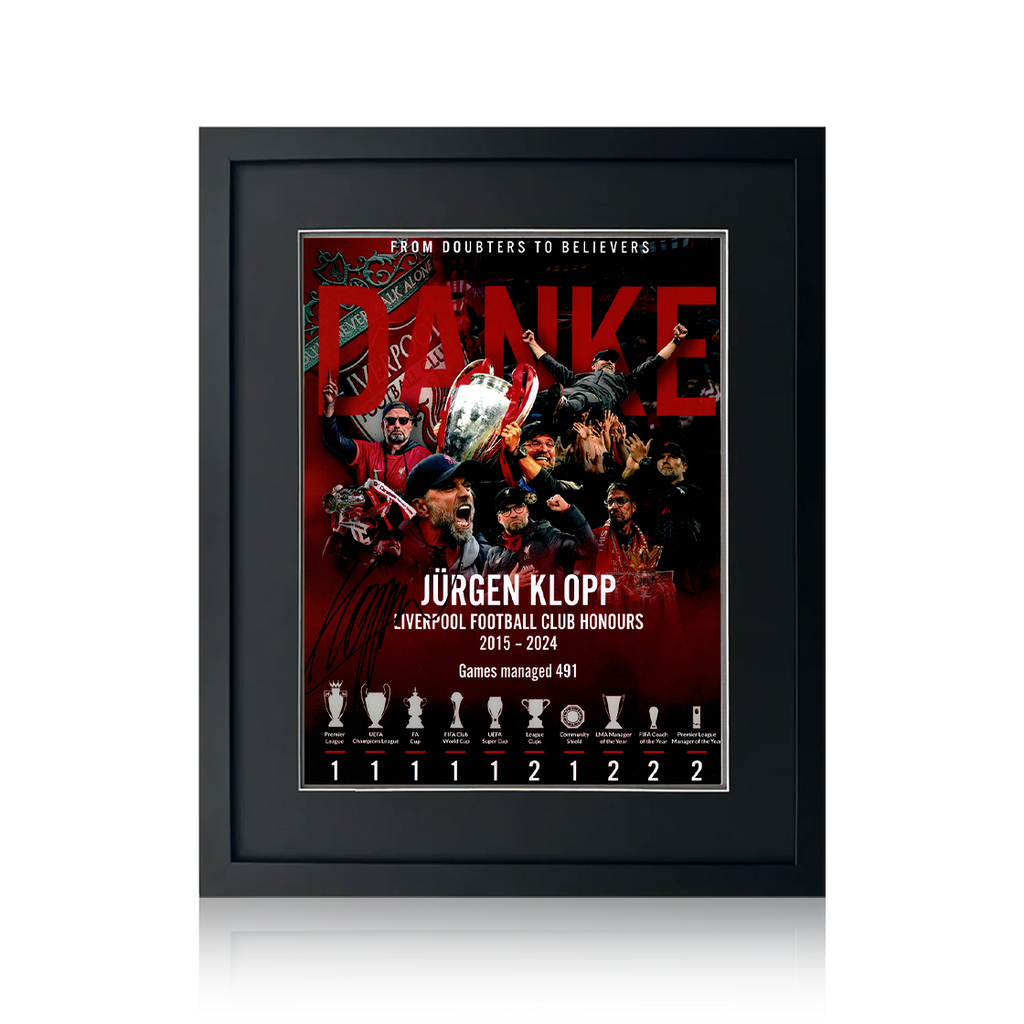 Authentic Jürgen Klopp signed memorabilia by The Fan Cave. You can purchase a piece of football history with our extensive Jürgen Klopp signed memorabilia collection.
