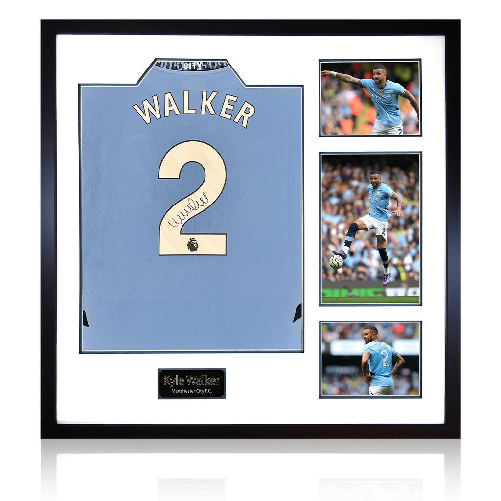 3 photo signed shirt display by Kyle Walker. So far in his Manchester City career his has won 11 trophies with the club which include 4 Premier League titles, 1 FA Cup, 2 Community Shields and 4 League Cups in a row.