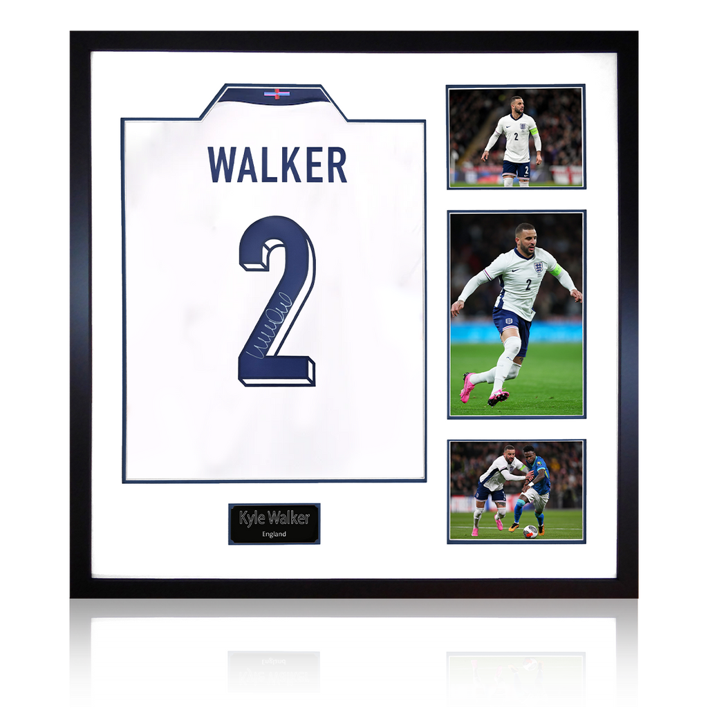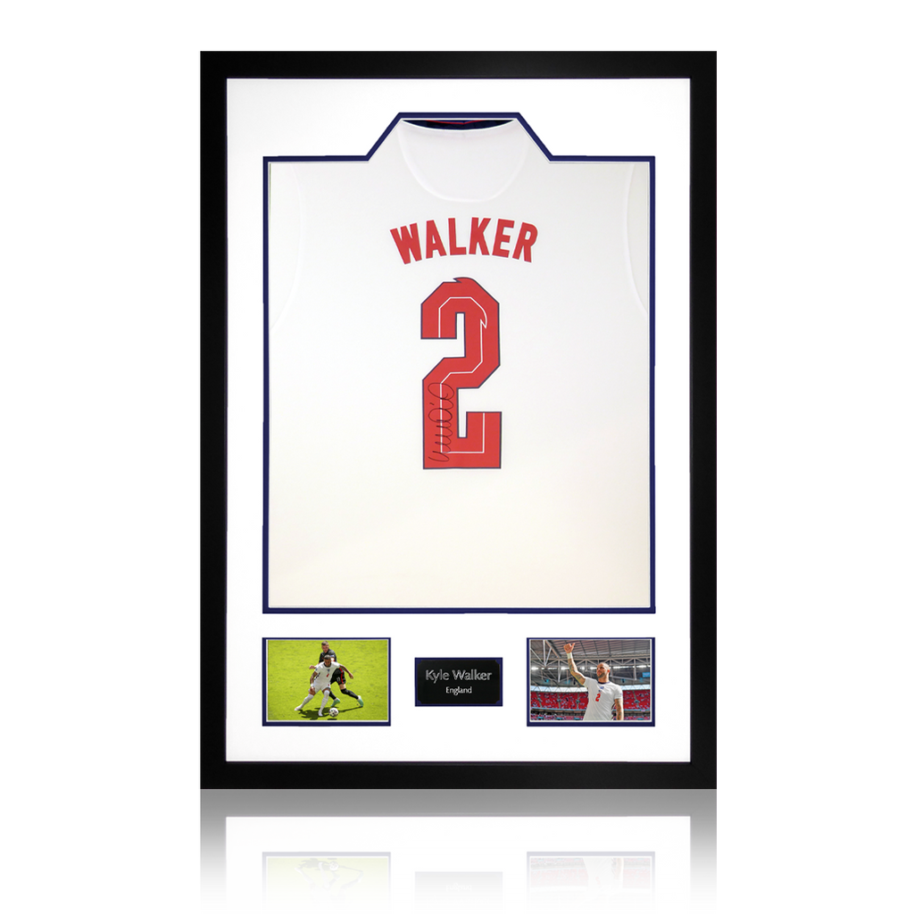 Beautifully presented Premium Frame with signed England shirt from Kyle Walker. This item was signed at an exclusive Fan Cave signing with Kyle. The frame measures approximately 690mm x 480mm. This item is accompanied with an c...