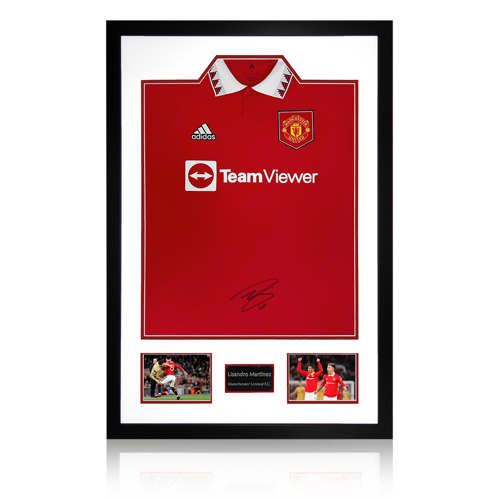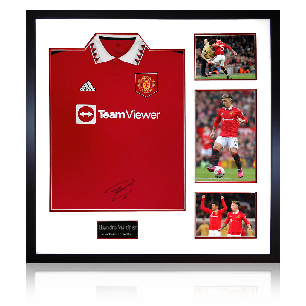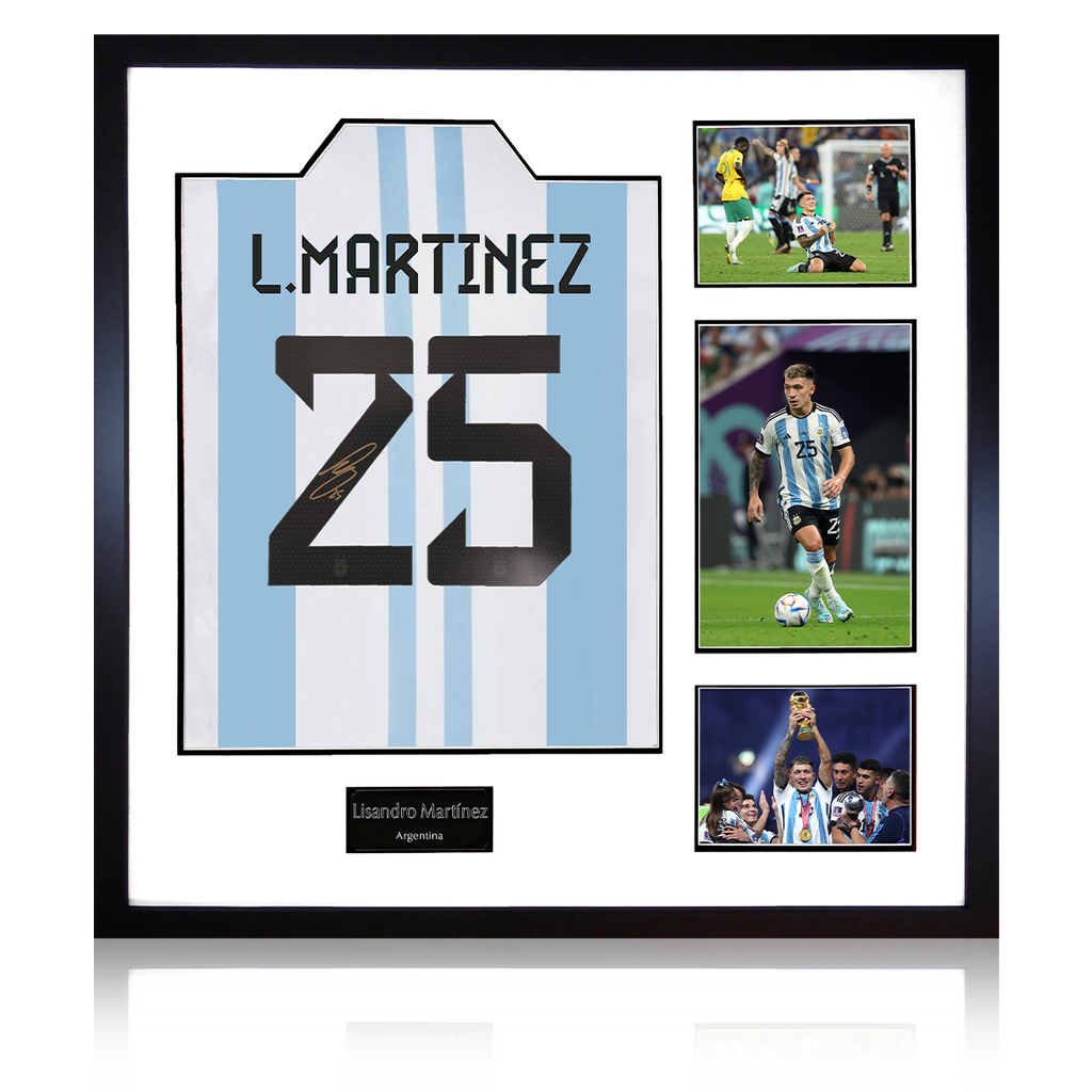 Signed shirt display in a wooden frame with photos and an etched plaque. The shirt has been signed by Argentinian defender and world cup winner; Lisandro Martínez.