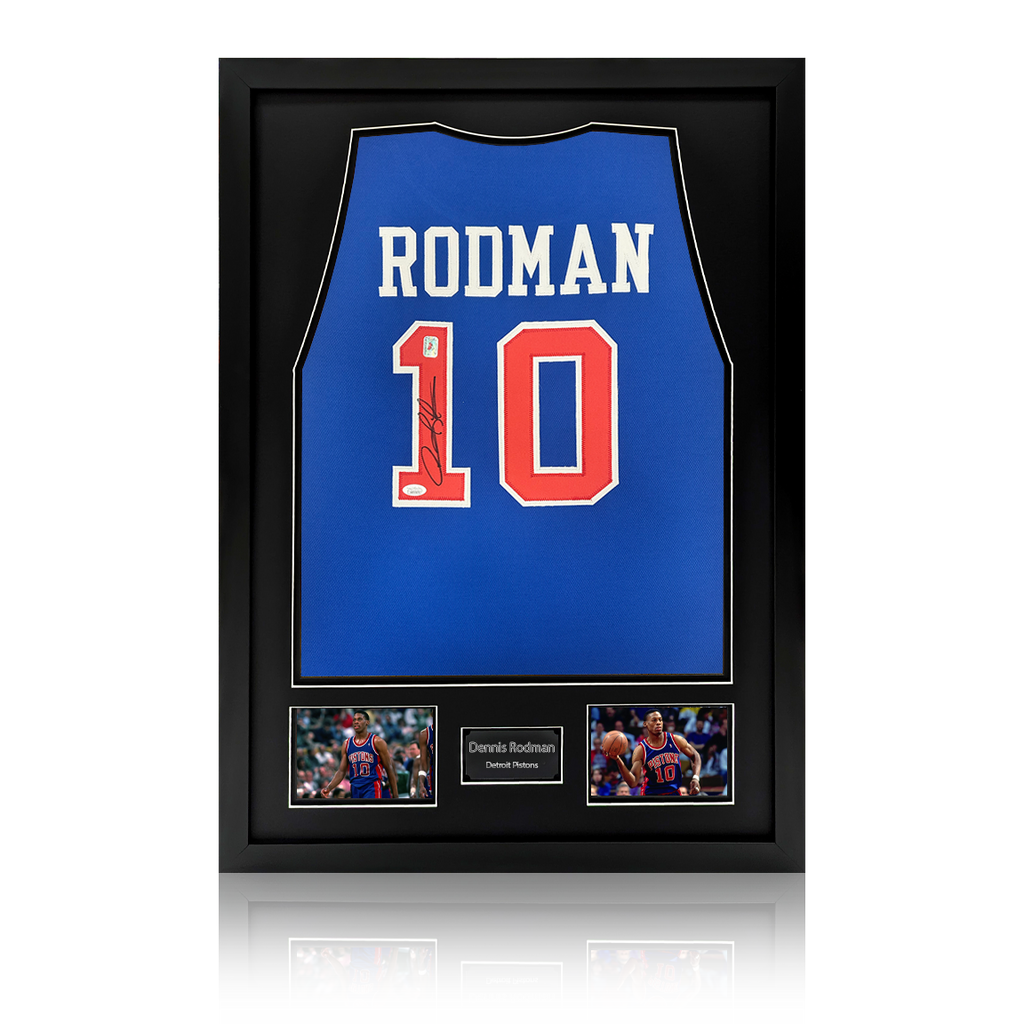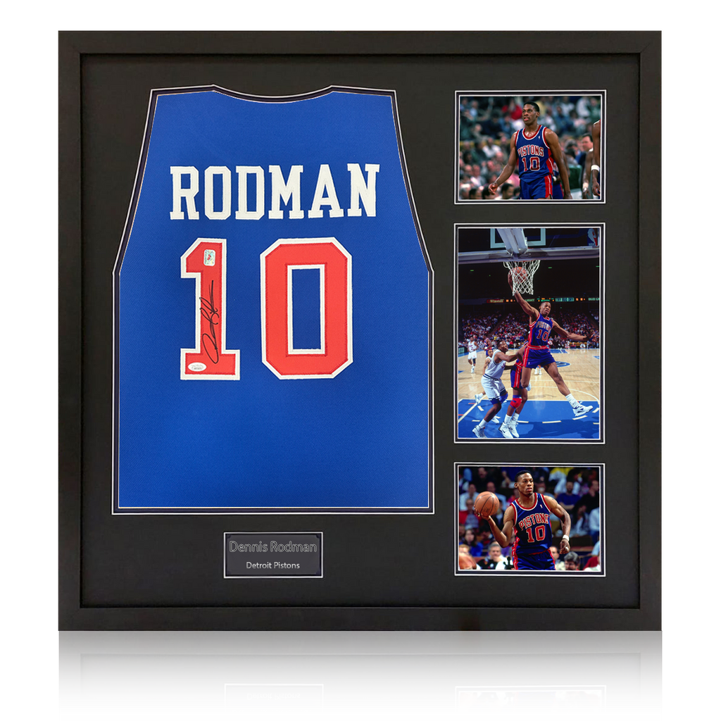 Wooden framed Detroit Pistons jersey. Hand-signed by Dennis Rodman. The autograph includes an official JSA Authentication Services serially numbered hologram for authenticity purposes. The signing of this item was witnessed by ...