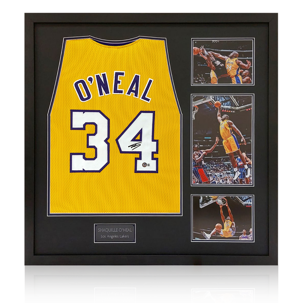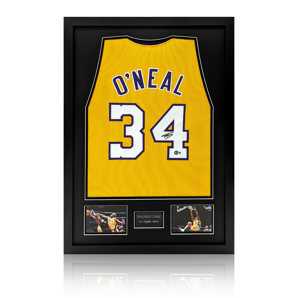 Wooden framed LA Lakers jersey. Hand-signed by Shaquille O'Neal. The autograph includes an official Beckett Authentication Services serially numbered hologram for authenticity purposes. The signing of this item was witnessed by...