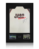 Juan Pablo Montoya signed shirt in a premium frame. This wooden framed display contains a signed shirt, etched plaque and 2 photos. This item measures approximately 850mm x 600mm. This item is accompanied with an certificate of authenticity from The Fan Cave.