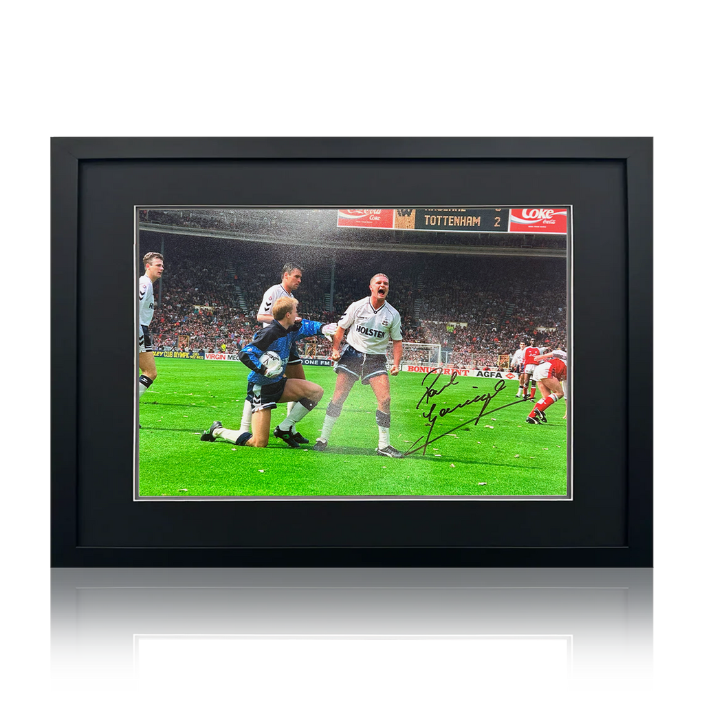 Wooden framed mount display containing a signed 18x12 Tottenham Hotspur image from legend, Paul Gascoigne. Size of the product is approximately 595 x 480mm. This item comes with an The Fan Cave Memorabilia certificate of authen...