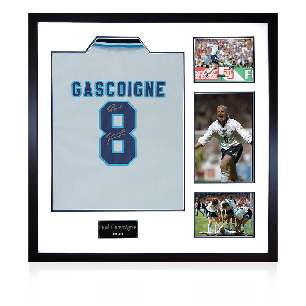 England Euro 96 shirt display signed by English footballing legend Paul Gascoigne who's famous "dentist chair" celebration after scoring his iconic goal against Scotland is one of English footballs most memorable moments....