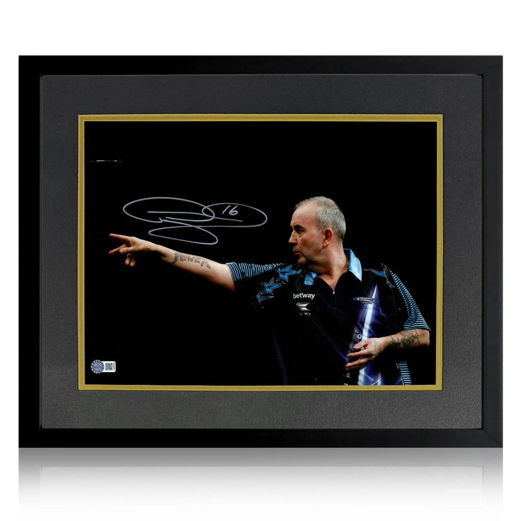 A signed Phil Taylor 16x12 image in a Deluxe Mount Frame. This item measures approximately 550mm x 450mm. This item is accompanied with an certificate of authenticity from The Fan Cave.
